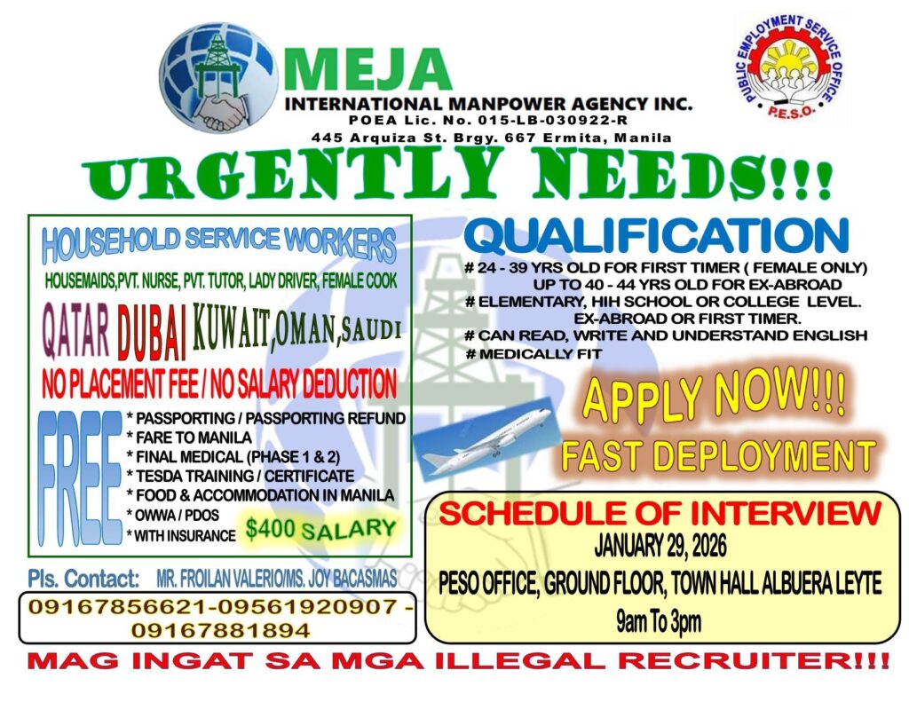 PMEJA International Manpower Agency SRA held a Special Recruitment Activity (SRA) at the Public Employment Service Office of LGU Albuera last January 29, 2026. While only 3 were interviewed on-site, a couple of interested job seekers have forwarded their resume to PESO Albuera even after the SRA concluded. All resumes were forwarded the MEJA’s agency representative.