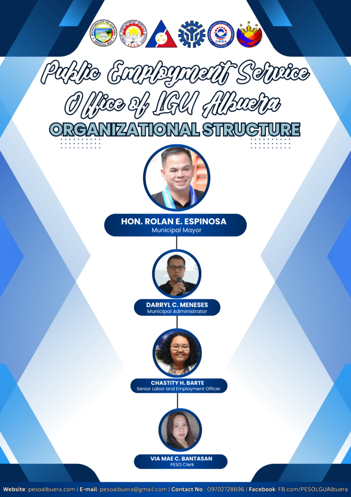 The Public Employment Service Office of LGU Albuera was created under Municipal Ordinance No. 2023-03 and was fully institutionalized on January 1, 2024. The office has only one permanent plantilla position, the Senior Labor and Employment Officer, which was filled last October 3, 2024.